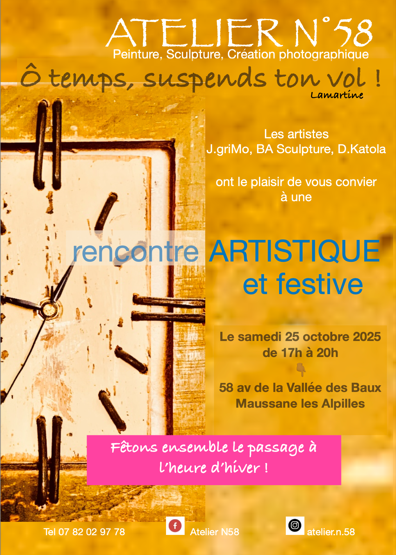 Rendez-vous le samedi 25 octobre à l’Atelier N°58 : au milieu des tableaux de Joëlle griMo, des statuettes de BA Sculpture et des créations photographiques de Daniel Katola, vous pourrez partager entre 17h et 20h un moment de convivialité autour d’un verre et échanger avec les artistes sur leur travail, leur technique, leur démarche artistique…