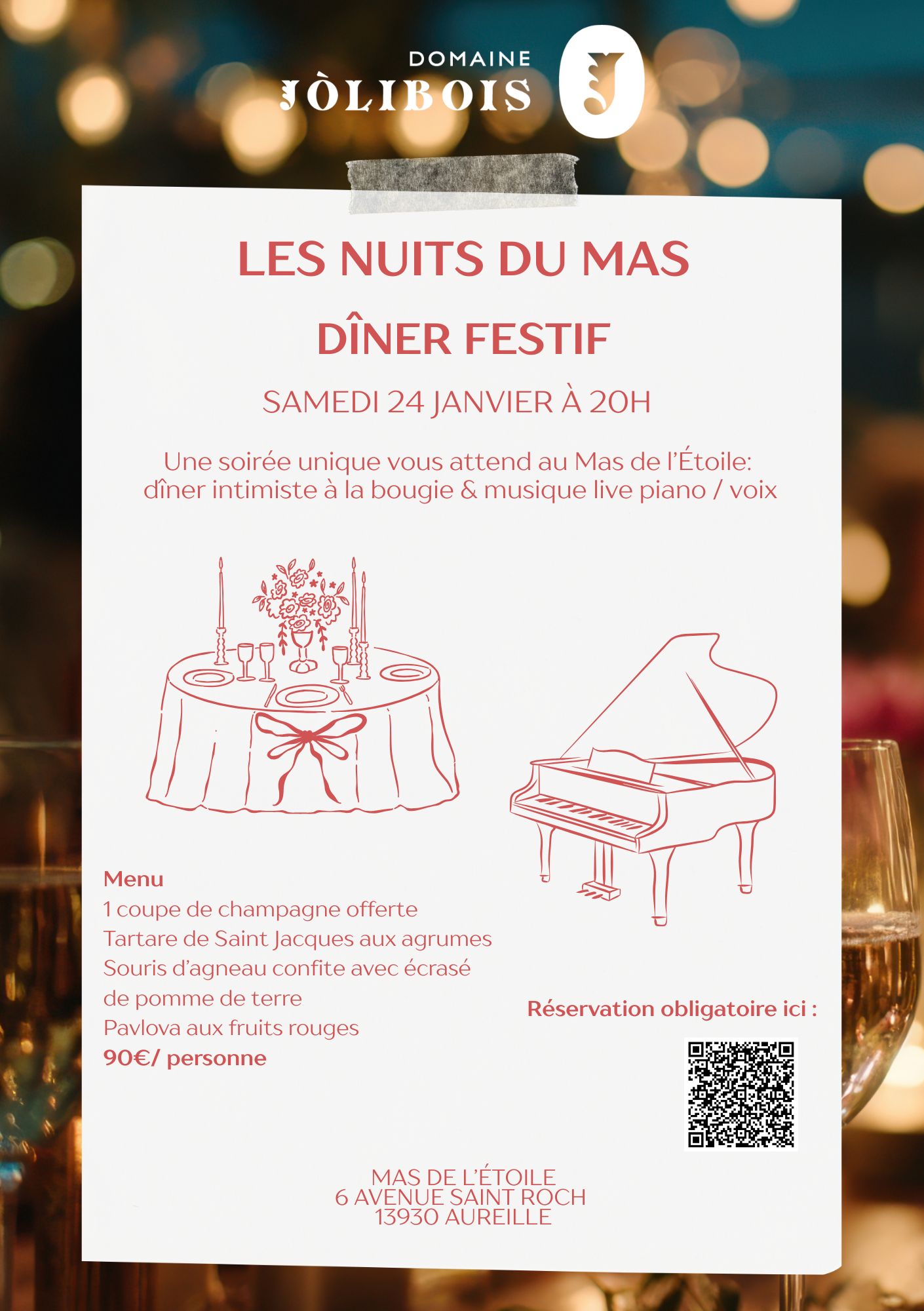 Réservations sur https://domaine-jolibois.com/products/diner-festif-au-mas-de-letoile